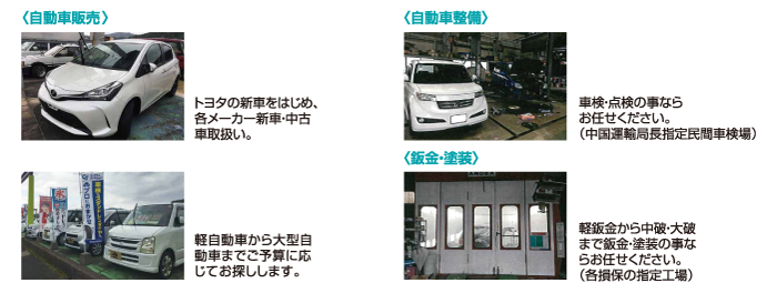 車販、整備、鈑金、塗装、リサイクルパーツ販売、何でもお気軽にご相談ください。